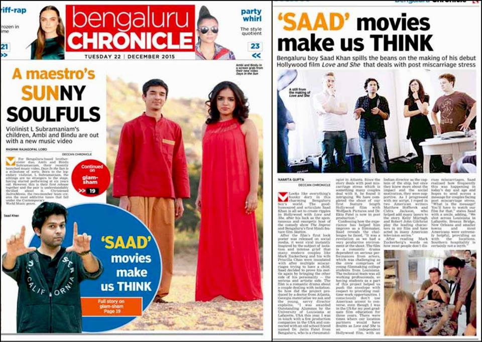 After working in Bollywood as an Associate Director to Oscar-nominated filmmaker Ashutosh Gowariker, Saad made Bangalore’s first Hindi feature film Station, independently produced by Sumit Ghosh and released across India by PVR Director’s Rare in 2014. The film released in Indonesia as well to positive reviews and has all newcomers acting alongside established Bollywood actor, Gulshan Grover. In 2015, Saad filmed his first Hollywood feature film titled ‘Love And She’ in Louisiana. Produced by Dr. Jatin Patel from Atlanta, the film is a drama about a married couple dealing with post-miscarriage trauma. Saad graduated as a Mechanical Engineer from Bangalore, India and has a Master’s degree in Communication and Film from the US.